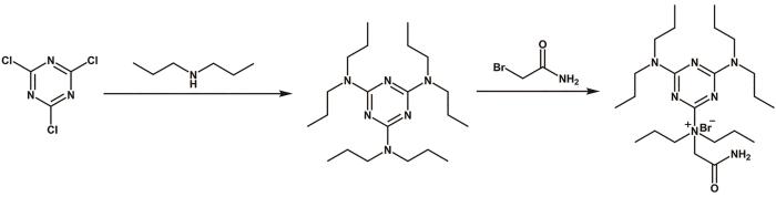 CCDY缓蚀剂分子的合成原料主要包括三氯三嗪(99%)、正二丙胺(98%)、丙酮(AR)、氢氧化钾(KOH,98%)、乙醇(AR)、二甲基亚砜(AR)、2-溴乙酰胺(98%)、乙醚(AR)、二氯甲烷(AR)。如图1所示为具体的合成路径。首先,在一个容量为250 mL的三口烧瓶中,加入100 mL乙醇和50 mL丙酮作为溶剂,加入10 mmol三氯三嗪和40 mmol正二丙胺,常温反应30 min后,加入30 mmol KOH并将烧瓶置于40 ℃油浴锅中,继续反应2 h,然后升温至80 ℃反应8 h。反应结束后将溶液冷却至室温析出固体,用乙醇重结晶纯化即得2,4,6-三(二丙氨基)-1,3,5-三嗪。在100 mL单口烧瓶中加入30 mL二甲基亚砜作为溶剂,加入5 mmol 2,4,6-三(二丙氨基)-1,3,5-三嗪和5 mmol 2-溴乙酰胺,将烧瓶置于120 ℃油浴锅中反应12 h。反应结束后加入二氯甲烷析出固体,离心分离得到固体并干燥即得季铵盐缓蚀剂CCDY,以三氯三嗪计算,3次重复实验的平均产率为61.67%。