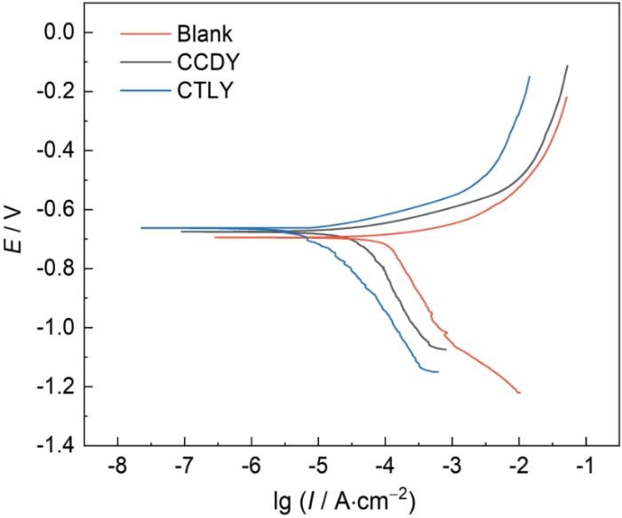 (2) 动电位极化曲线结果显示,CCDY与CTLY复配的缓蚀剂表现出抑制阳极反应的混合型缓蚀特性。CTLY在Q235钢表面的吸附遵循Langmuir吸附等温式,其吸附模式以化学吸附为主导,且能在Q235钢表面形成牢固的混合型吸附层。