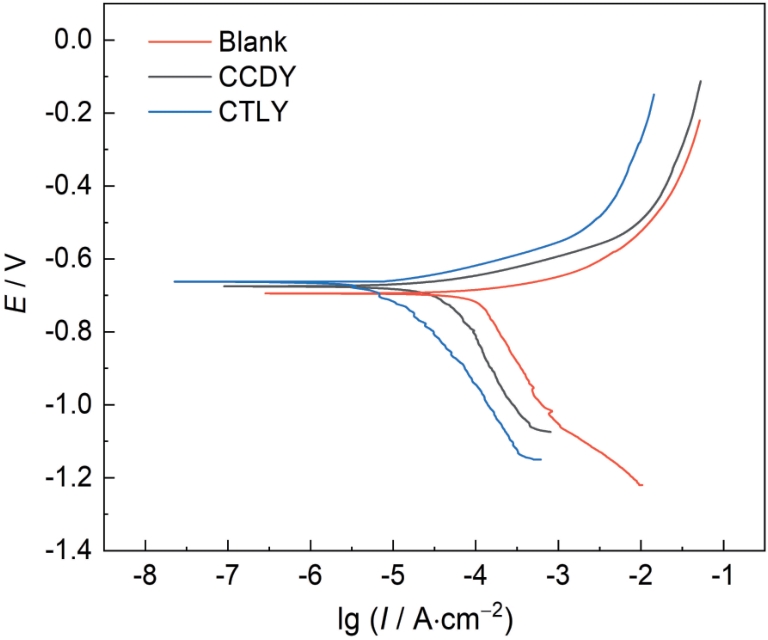| 图6 Q235钢在80 ℃下含CCDY及复配缓蚀剂的0.5 MPa CO2、3.5%NaCl溶液中的极化曲线 |