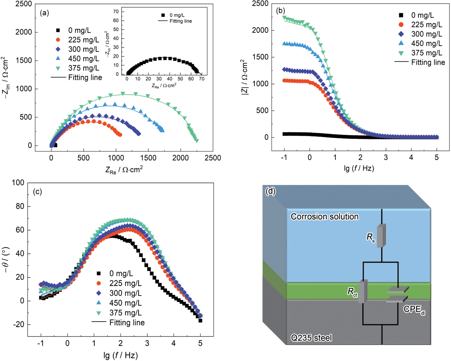 | Fig.7 Nyquist (a), impedance module (b) and phase angle (c) plots of Q235 steel in 0.5 MPa CO2 saturated 3.5% NaCl solutions containing different concentrations of CTLY, and corresponding equivalent circuit model (d) |