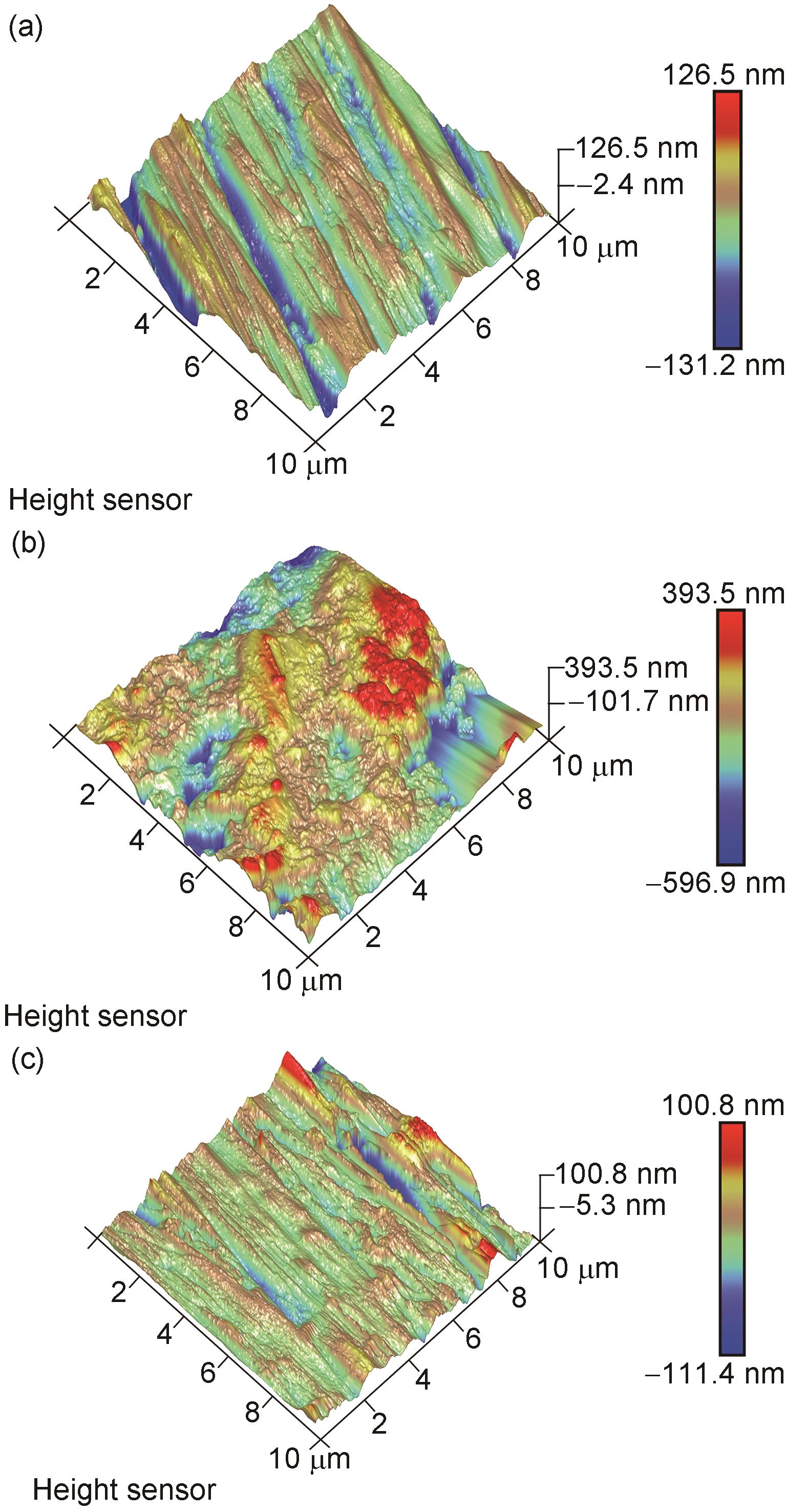 | Fig.10 3D-AFM surface micrographs of Q235 steel before (a) and after (b, c) corrosion in 0.5 MPa CO2 saturated 3.5%NaCl solutions without (b) and with (c) CTLY |