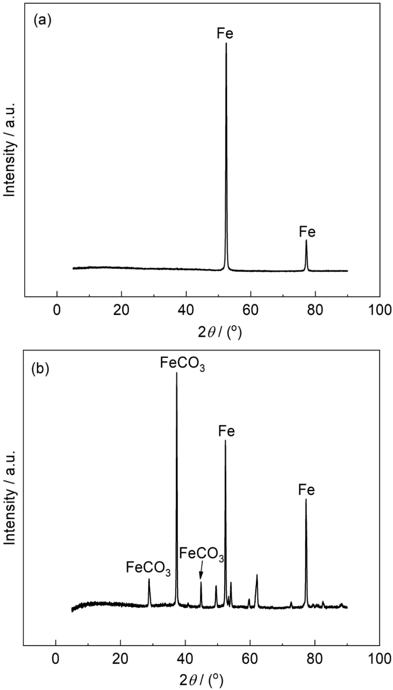 | Fig.11 XRD patterns of Q235 steel after corrosion in 0.5 MPa CO2 saturated 3.5%NaCl solutions with (a) and without (b) CTLY |