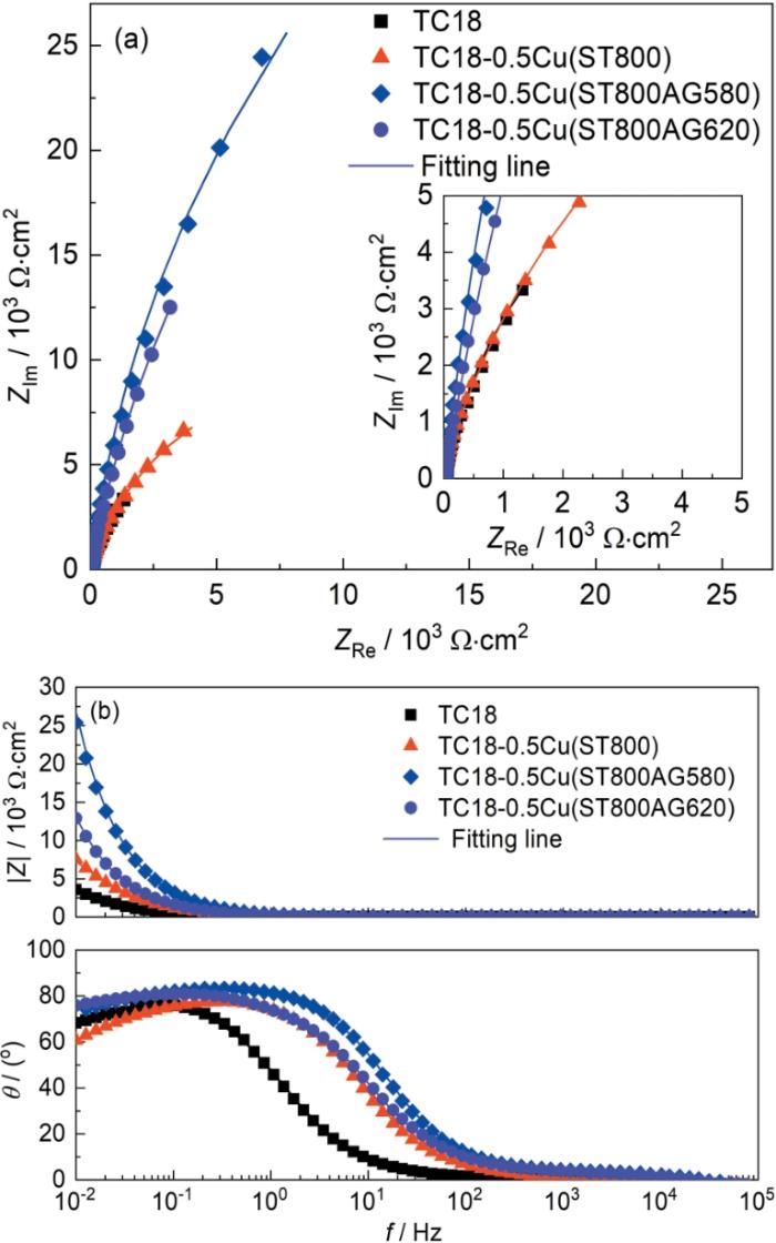 ... 为了研究钛合金TC18以及不同热处理工艺的TC18-0.5Cu试样在SRB地层水中耐腐蚀性能,使用CS350H型电化学工作站进行电化学测试.采用了三电极体系[35],其中饱和甘汞电极作为参比电极,铂电极作为对电极,工作电极分别为TC18、TC18-0.5Cu (ST800)、TC18-0.5Cu (ST800AG580)以及TC18-0.5Cu (ST800AG620)试样.将试样与铜导线连接后,使用环氧树脂进行密封,工作电极的面积为1 cm2. ...