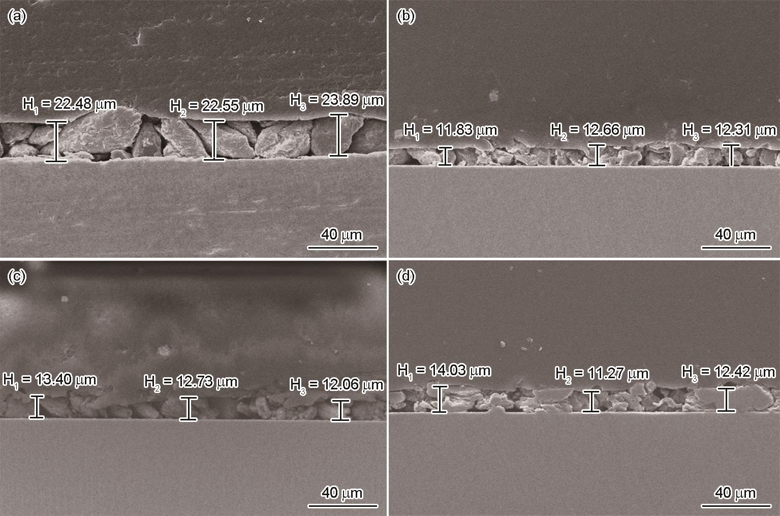 | Fig.4 Thicknesses of SRB biofilms on TC18 Ti-alloy (a), TC18-0.5Cu (ST800) alloy (b), TC18-0.5Cu (ST800AG580) alloy (c), and TC18-0.5Cu (ST800AG620) alloy (d) |