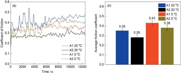 Friction coefficient vs. time curves (a) and average friction coefficients (b) of A1 and A2 during friction in seawater medium at 0 oC and 20 oC