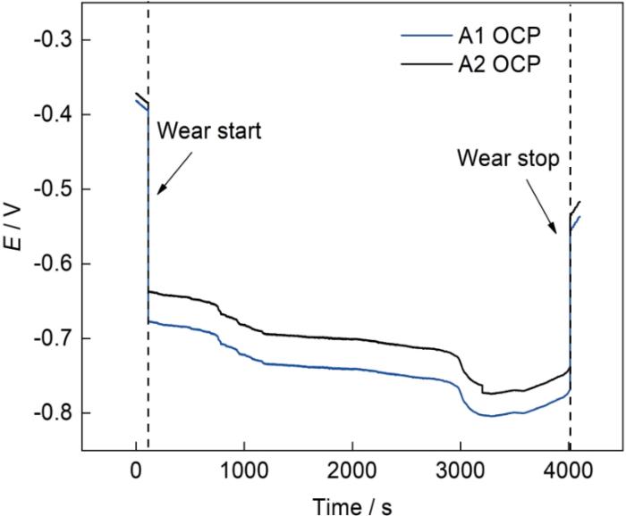 Open circuit potentials of A1 and A2 before, during and after friction under the condition of no applied protective potential