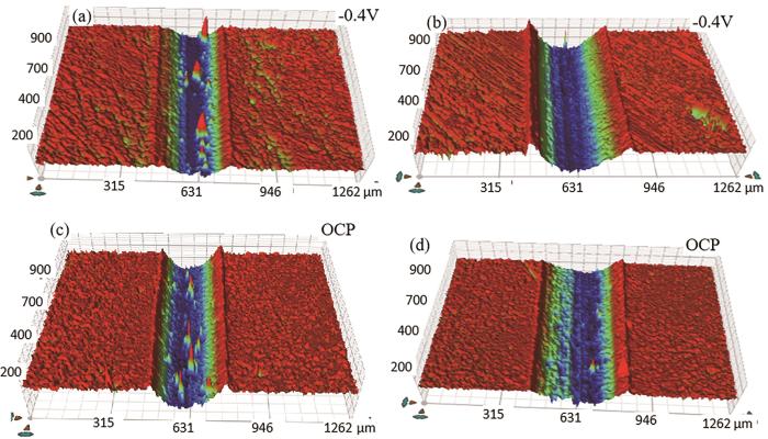 2种FH40钢样在有、无阴极保护下摩擦后磨痕三维形貌图
