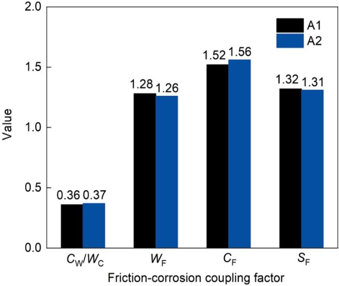 Friction-corrosion coupling factor for A1 and A2 samples of FH40 steel
