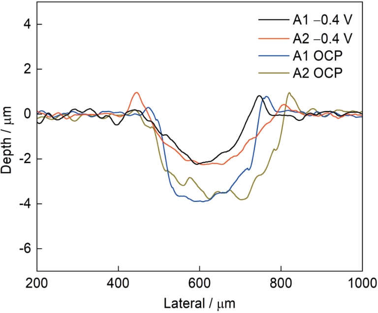 | Fig.8 Cross-sectional profiles of wear tracks of A1 and A2 after friction tests with and without cathodic protection |