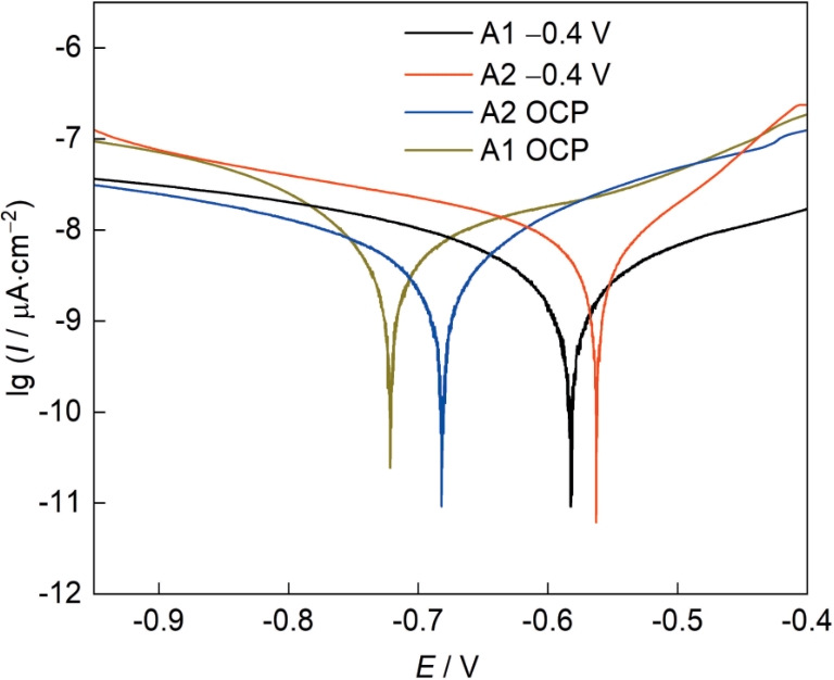 | Fig.6 Potentiodynamic polarization curves of A1 and A2 under the conditions of unapplied and applied protective potential |