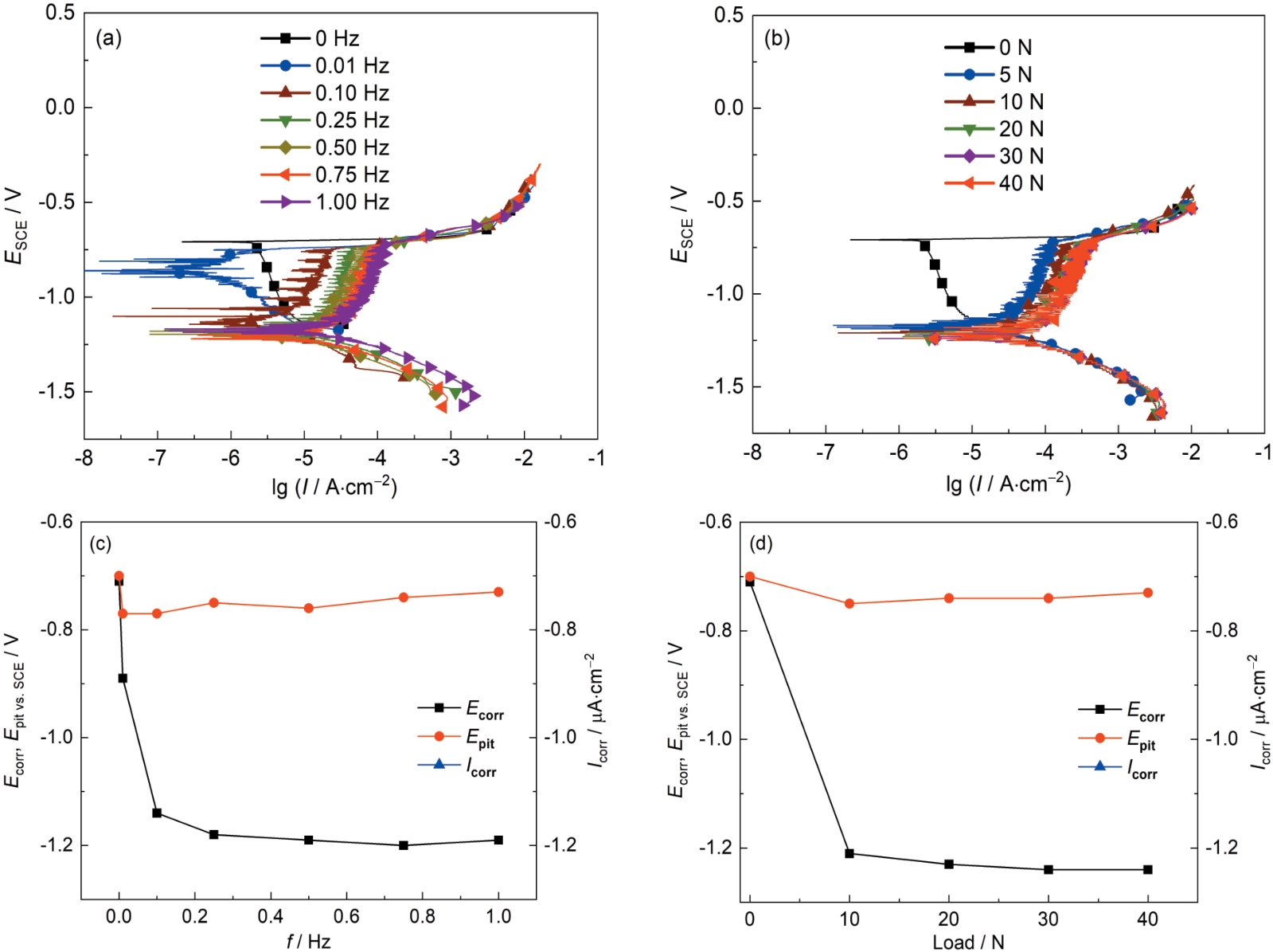 | Fig.3 Potentiodynamic polarization curves (a, b) and fitting date (c, d) of 7075 Al-alloy during tribo-corrosion at different frequencies (a, c) and applied loads (b, d) |