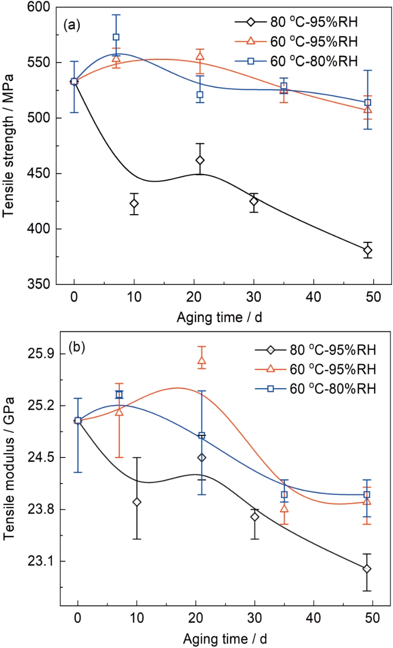 | Fig.4 Variation of tensile properties of GFRP specimens with aging time: (a) tensile strength, (b) tensile modulus |