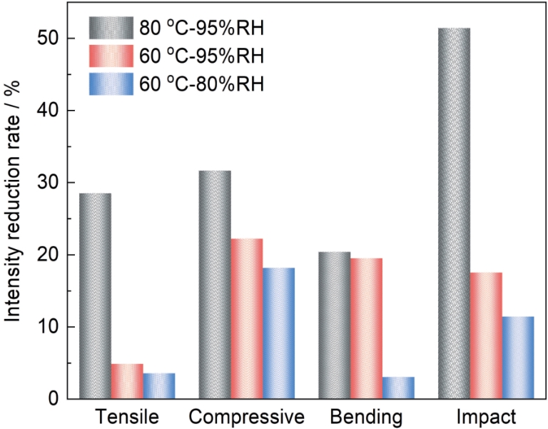 | 图8 GFRP样品老化49 d后力学强度下降率 |