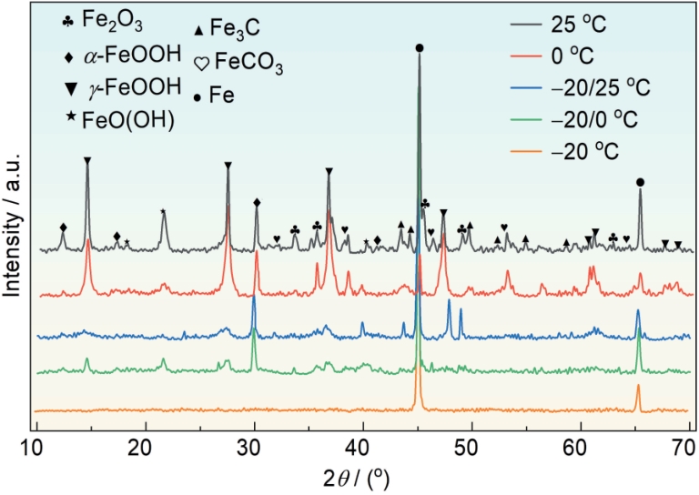 | Fig.6 XRD spectra of J55 steel immersed in simulated formation water environment for 50 d at different temperatures |