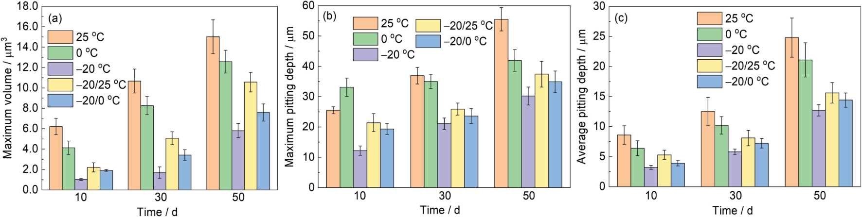 | Fig.8 Maximum volumes (a), maximum depths (b) and average depths (c) of pits for J55 steel immersed in simulated formation water environment at different temperatures for 10, 30 and 50 d |