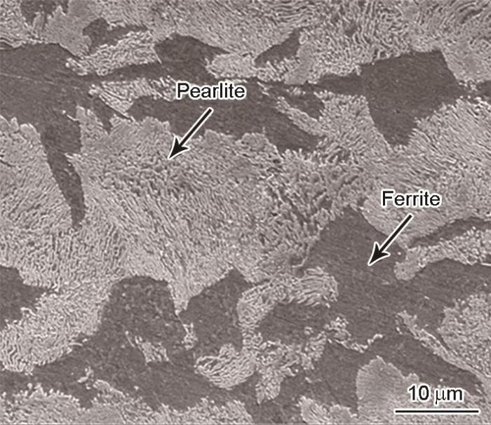 图2为失效N80油管钢微观组织形貌的SEM图。从图中可以看出,N80油管组织为块状铁素体+片层珠光体,组织均匀,未见异常。