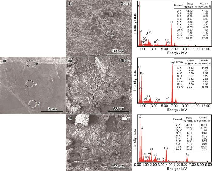 Microstructures of the different zones of fracture surface of N80 tubing and corresponding compositions of corrosion products: (a) fracture surface, (b) outer zone, (c) middle zone, (d) inner zone