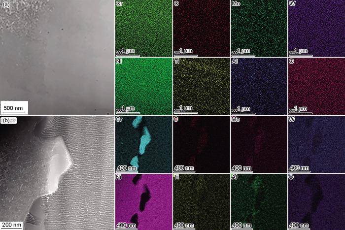 TEM images and EDS element mappings of SLM GH4099 (a) and HT GH4099 (b)