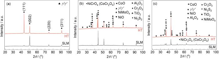 XRD patterns of SLM GH4099 and HT GH4099 after hot corrosion for 0 h (a), 60 h (b) and 120 h (c)
