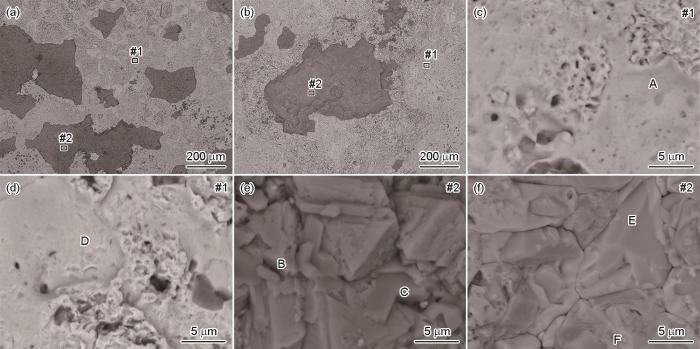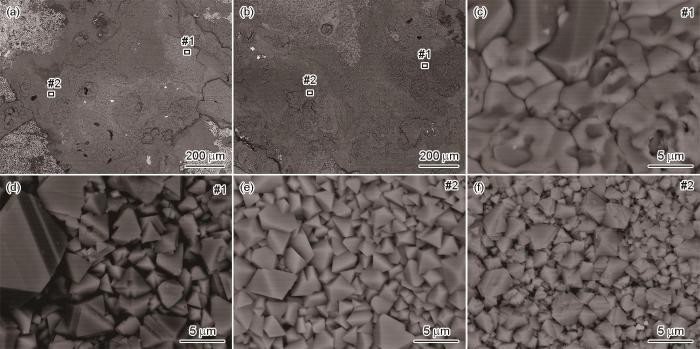 图5为热处理前后试样在经过Na2SO4和NaCl混合盐中循环热腐蚀60 h后的宏观形貌和微观形貌,其相应区域的EDS结果如表1所示。如图5a和b所示,两种试样表面的氧化膜大范围的脱落,只观察到少量的块状的腐蚀产物被保留下来,且基体裸露在在表面,可以观察到基体表面上细小的孔洞。图5c和d是两种试样表面氧化物脱落的基体的高倍SEM,可以看出在基体内存在1~5 μm不等的微孔。通对SLM试样在A区域内EDS结果可以看出,脱落氧化层的基体主要是富含Ni为主的氧化产物。相似的,HT试样在D处脱落氧化层的基体主要Co为主的氧化物。图5e和f分别为两种试样表面的氧化物层高倍SEM,对SLM试样氧化层的EDS结果显示主要包含O、Al、Ti、Cr、Co和Ni,可能是Al2O3、TiO2、Cr2O3氧化物和NiMoO4、NiCr2O4、CoCr2O4尖晶石。图6为经过在Na2SO4和NaCl混合盐中120 h热腐蚀后的宏观形貌和微观形貌,可见,相比其他阶段表面保留的氧化产物较多,这与腐蚀动力学和XRD的结果相同。如图6a和b所示,两种试样表面均存在氧化产物剥落现象,相比60 h试样表面的氧化产物,NiCr2O4、CoCr2O4尖晶石更细小,在尖晶石下方为氧化物层。