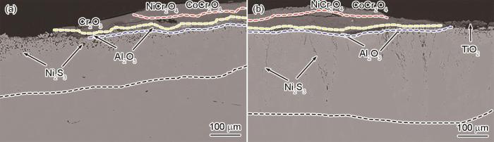 Cross-sectional morphologies of SLM GH4099 (a) and HT GH4099 (b) after 120 h hot corrosion