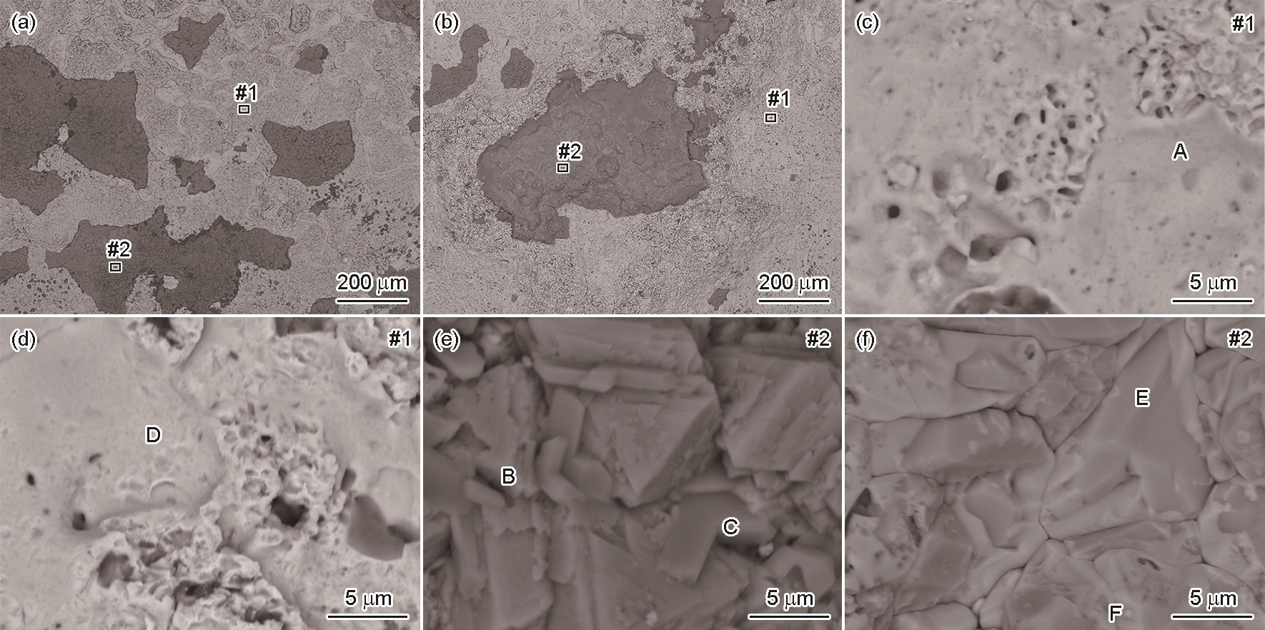 | Fig.5 Surface morphologies of SLM GH4099 (a, c, e) and HT GH4099 (b, d, f) after hot corrosion at 900 oC for 60 h |