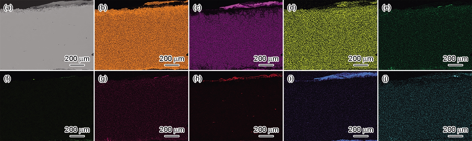 | Fig.7 Cross-sectional morphology (a) and EDS element mappings of Ni (b), Cr (c), Co (d), S (e), W (f), Mo (g), Al (h), O (i) and Ti (j) of SLM GH4099 after 120 h hot corrosion |