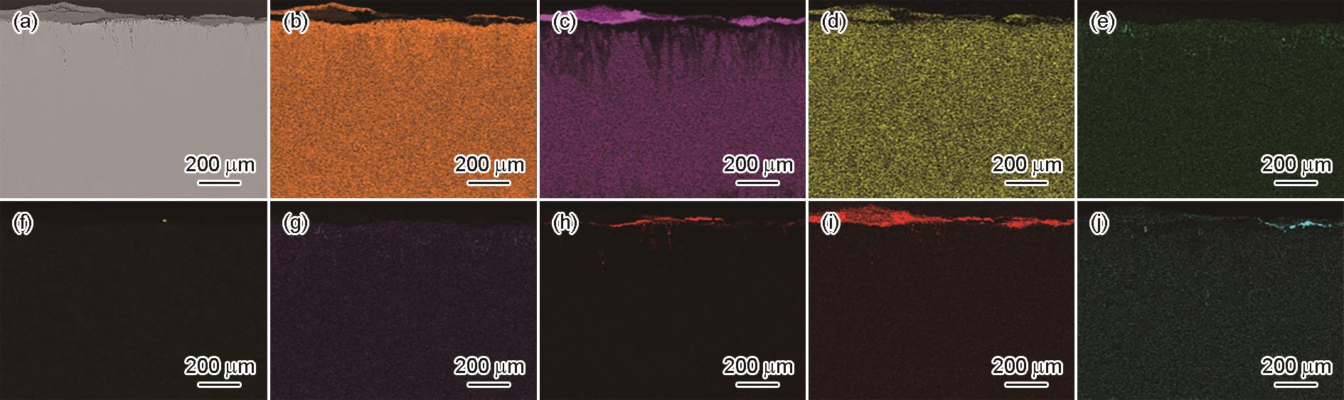 | Fig.9 Cross-sectional morphology (a) and EDS element mappings of Ni (b), Cr (c), Co (d), S (e), W (f), Mo (g), Al (h), O (i) and Ti (j) of HT GH4099 after 120 h hot corrosion |