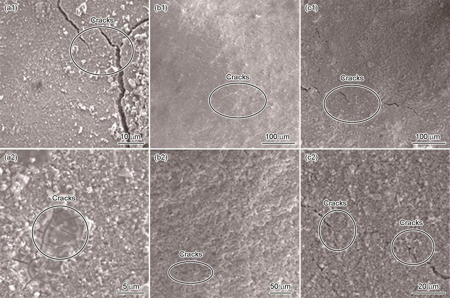 | Fig.1 Surface SEM morphologies and enlarged images of the coatings prepared from the precursor slurries containing 2% (a1, a2), 10% (b1, b2) and 20% (c1, c2) PVB |