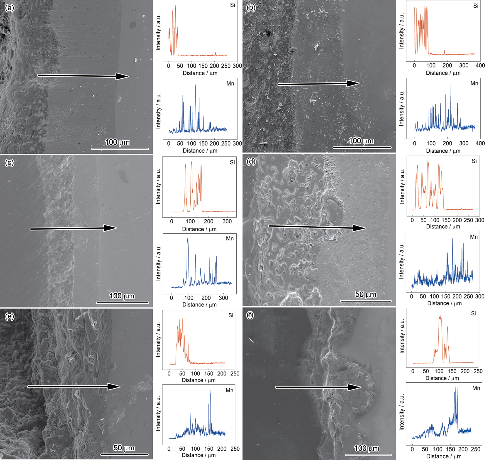 | Fig.3 Composition analysis results of the coatings prepared from the precursor slurries containing 2% (a), 5% (b),10% (c), 15% (d), 20% (e) and 30% (f) of PVB after oxidation at 1000 oC |