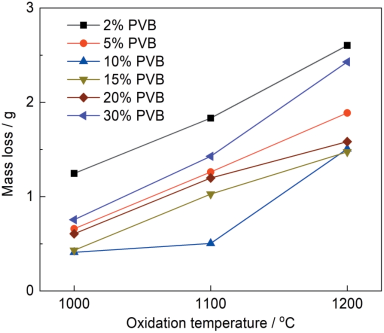 | Fig.5 Mass losses of the coatings prepared from the precursor slurries containing different contents of PVB after oxidation at 1000, 1100 and 1200 oC |