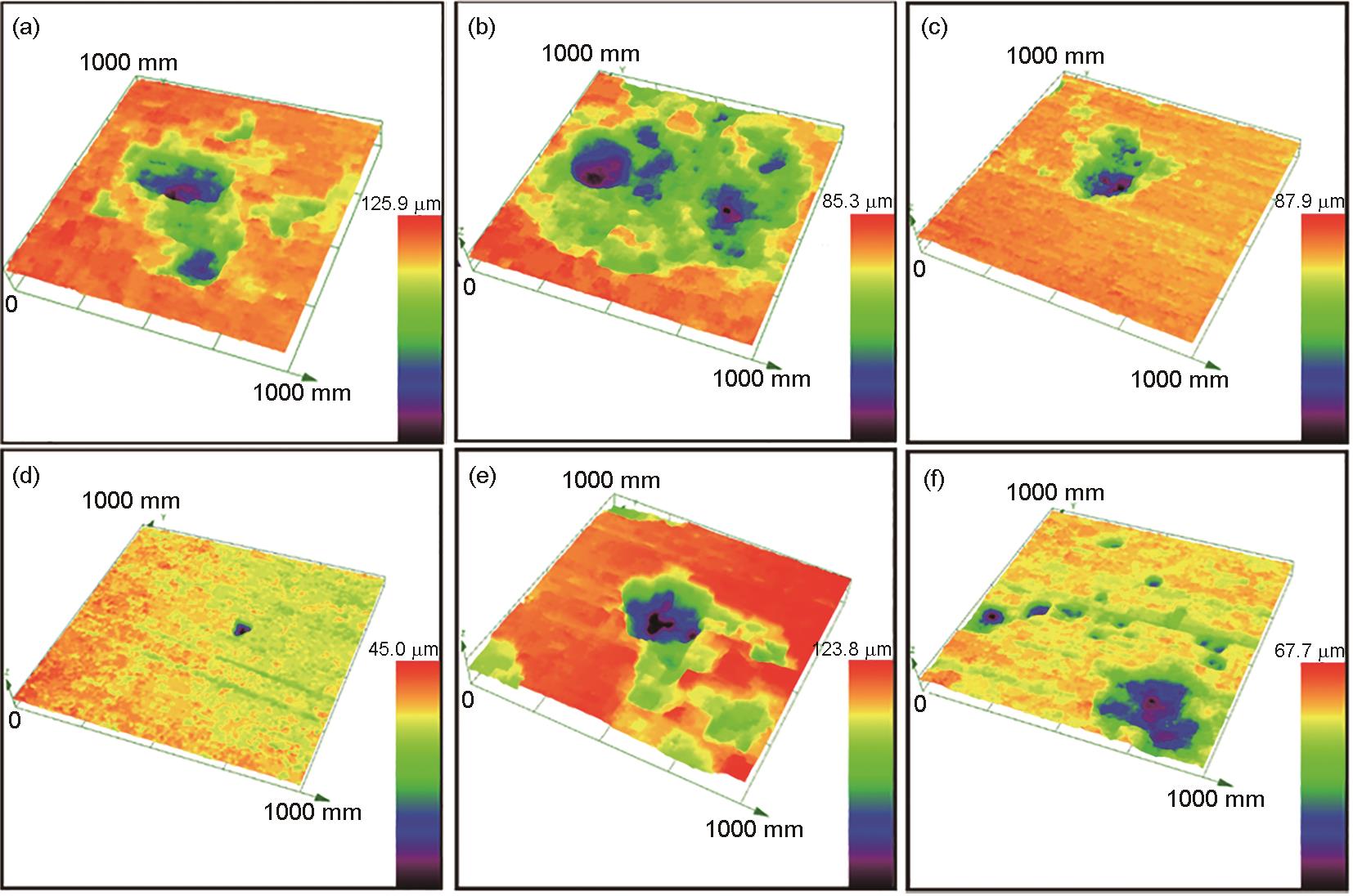 | Fig.2 3D surface morphologies of WS (a, b), BM (c, d) and HAZ (e, f) of 316L stainless steel after corrosion under 90 oC, pH = 3.5, 1 MPa H2S, 1000 mg/L Cl- (a, c, e) and 120 oC, pH = 3.5, 0.1 MPa H2S, 1000 mg/L Cl- (b, d, f) |