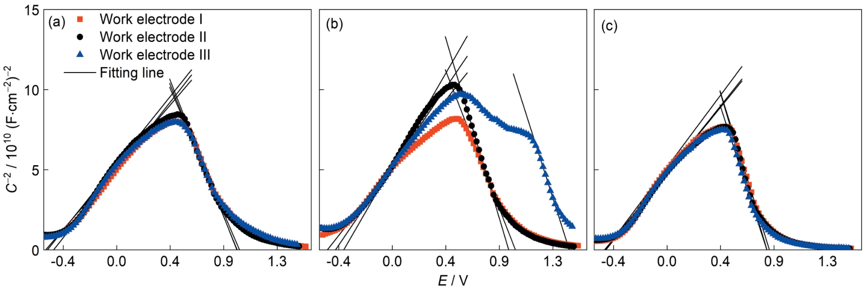 | Fig.4 Mott-Schottky plots of WS (a), BM (b) and HAZ (c) of 316L stainless steel |