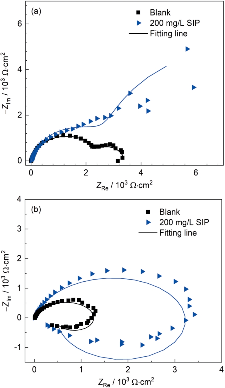 | Fig.4 Nyquist diagrams of 7075-T651 Al-alloy (a) and 7075-X70 coupling specimen (b) after immersion for 24 h in 3.5%NaCl solutions without and with 200 mg/L SIP |