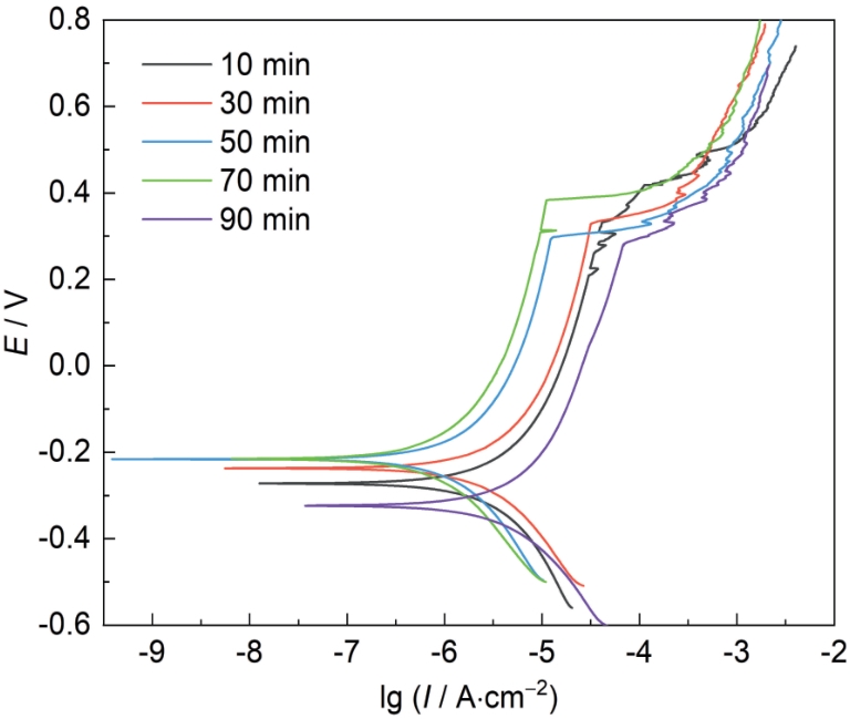 | 图3 304不锈钢在60 ℃下钝化不同时间后的极化曲线 |