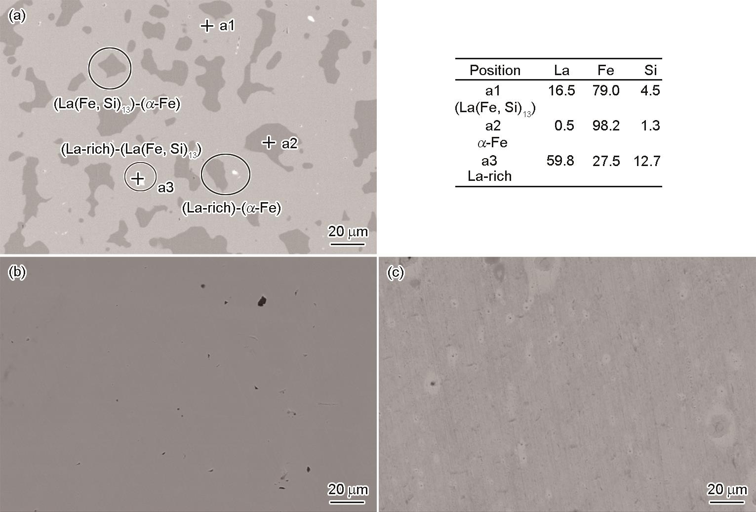 | Fig.2 BSE-SEM images of LaFe13.9Si1.4 (a), Fe (b) and La (c), and EDS analysis of three phases marked in Fig.2a |