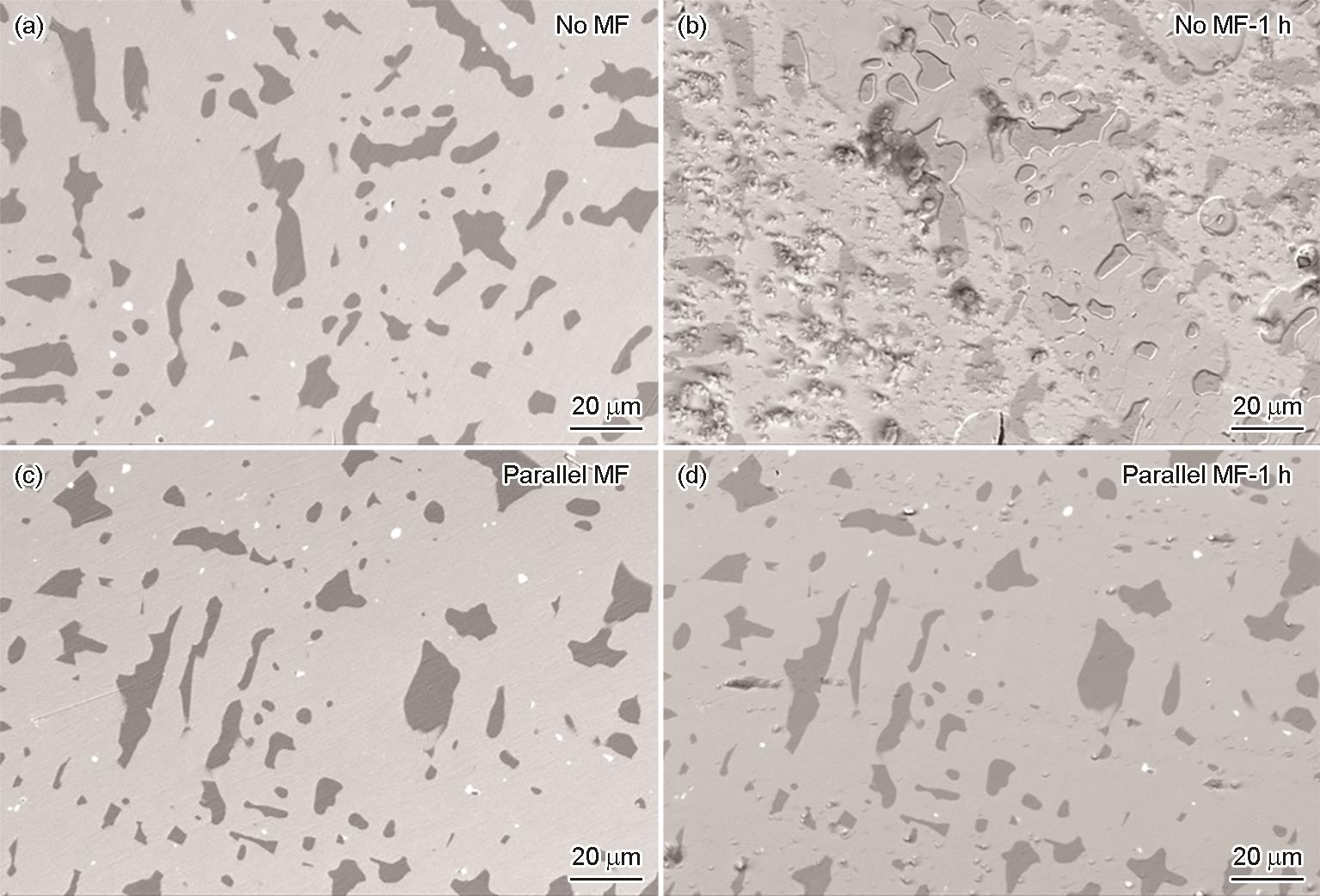 | Fig.5 SEM images of specific local areas of two LaFe13.9Si1.4 samples before (a, c) and after (b, d) immersion in 0.1 mol/L NaClO4 solution for 1 h under 0 T (b) and 1 T (d) parallel magnetic fields |