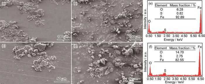 SEM surface morphologies (a-d) and EDS analysis results (e, f) of MIC resistant steel (a, b, e) and ordinary steel (c, d, f) after 14 d immersion in SRB inoculated solution