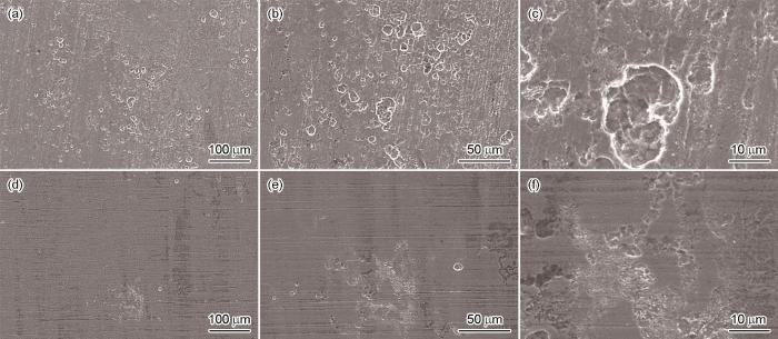 SEM surface morphologies of ordinary steel (a-c) and MIC resistant steel (d-f) after removal of corrosion products formed during 14 d immersion in SRB inoculated solution