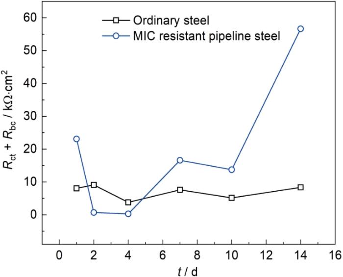 金属和液膜界面的双电层与生物膜和腐蚀产物层是影响电极反应过程的状态变量。电化学体系的极化电阻Rp可用拟合参数Rct + Rbc表示。Rp反映电极反应时的阻力大小,与腐蚀速率成反比。由Rct + Rbc随时间的变化(图10)可见,实验初期(前7 d)试样腐蚀速率较高,普通钢与耐MIC钢差别较小。7 d后,普通钢保持较高腐蚀速率,而耐MIC钢腐蚀速率出现明显下降,腐蚀电化学过程被显著抑制。