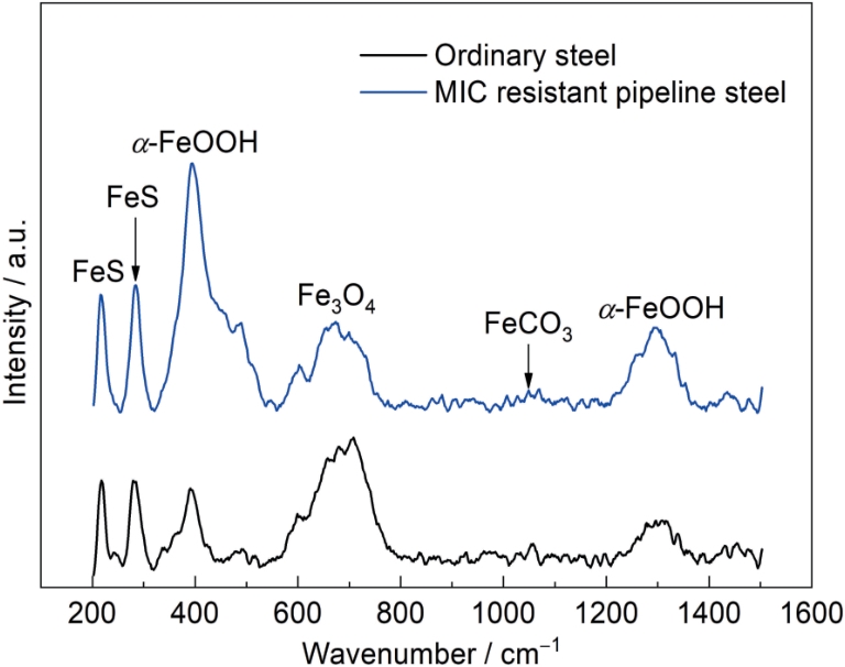 | Fig.3 Raman spectra of the surfaces of MIC resistant steel and ordinary steel after 14 d immersion in SRB inoculated solution |