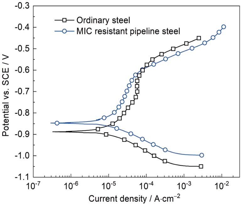 | Fig.7 Potentiodynamic polarization curves of MIC resistant steel and ordinary steel after 14 d immersion in SRB inoculation solution |