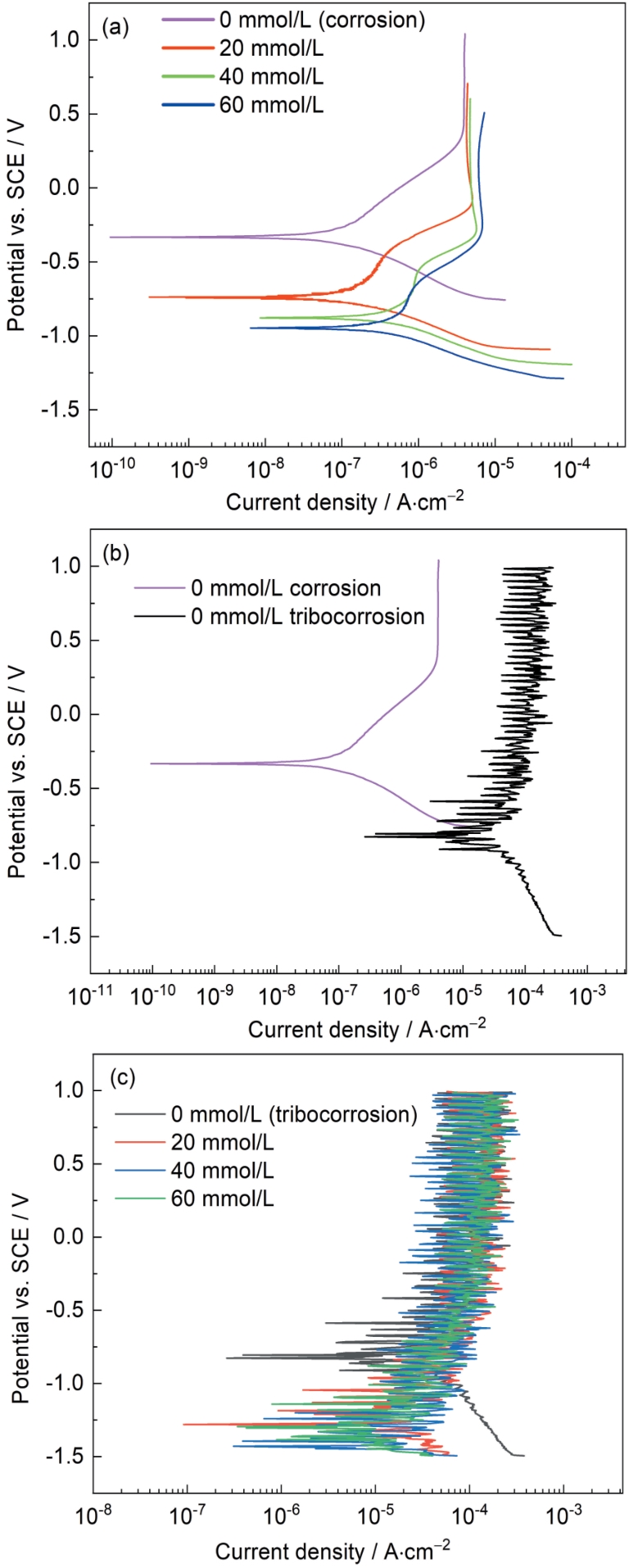 | Fig.2 Potentiodynamic polarization curves of TC4 Ti-alloy in 3.5%NaCl solutions containing 0, 20, 40 and 60 mmol/L S2- under static corrosion (a) and tribocorrosion (c) conditions, and 0 mmol/L S2- under corrosion and tribocorrosion conditions (b) |