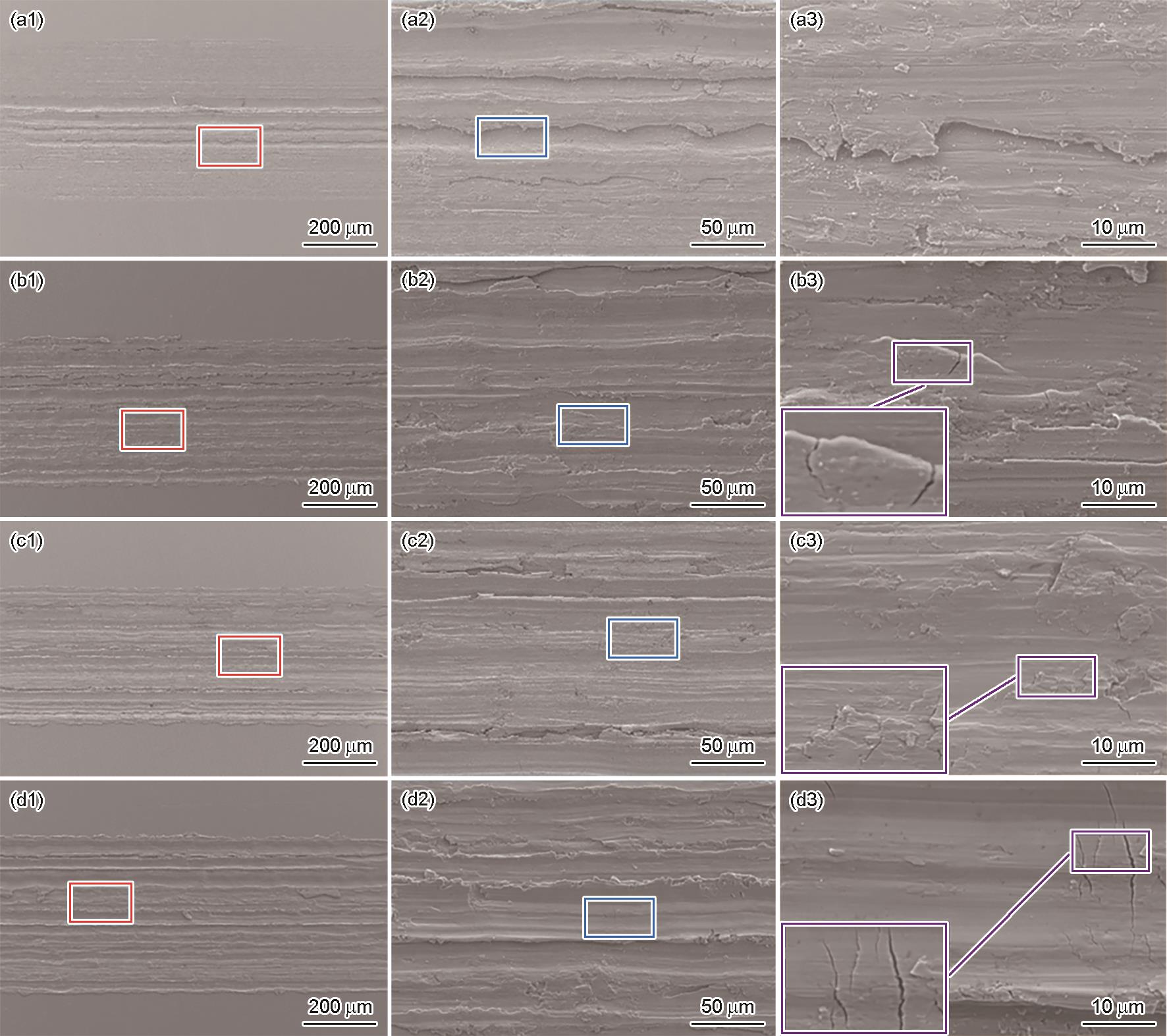 | Fig.6 Surface morphologies of TC4 Ti-alloy after tribocorrosion in 3.5%NaCl solutions containing 0 (a1-a3), 20 (b1-b3), 40 (c1-c3) and 60 (d1-d3) mmol/L S2- |