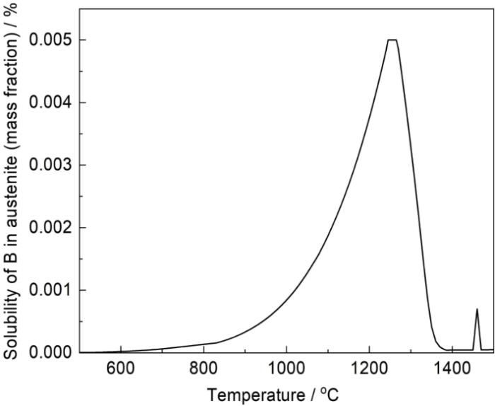 为了进一步分析低温扩散处理对晶界B的影响,采用Thermo-Calc计算软件,计算了B在fcc-Fe中不同温度的溶解度,图4给出了B在奥氏体钢中的溶解度曲线。可以看出1180 ℃固溶处理时,B在奥氏体基体中溶解度约为0.0031% (质量分数),由于不锈钢中B的添加量很低,为0.004%,应该1180 ℃固溶处理使得部分B溶在基体中。Xu等[22]利用微观组织表征和理论计算研究了B对σ相析出行为的影响,计算结果证实B优先偏聚于晶界,抑制Mo、Cr等的偏聚,从而抑制σ相的形成。Zhang等[23]研究表明B对析出相析出的机制以及对耐蚀性有影响,不仅抑制σ相的形成并可形成含B的Laves相,减少晶界附近的贫Cr区,提高SASS耐晶间腐蚀性能。结合SASS固溶处理后的淬水处理,固溶试样形成了过饱和固溶体,此时固溶态的试样中应该有部分B以过饱和形式溶于奥氏体基体或者缺陷中。由于B原子半径较小,为间隙原子,300 ℃下不同时间的扩散处理,B容易在保温过程中由奥氏体基体内向晶界扩散。扩散时间的长短对于B的扩散影响明显。从图2和3可见,300 ℃不同时间的扩散处理,影响了晶界析出相的析出,同时扩散时间不同晶界处B的能谱强弱也有差别,说明B扩散到晶界,影响时效过程中析出相的形成。