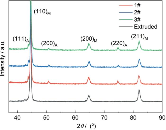 图1为17-4PH不锈钢DED样品和挤压件的XRD图。可以看出,DED样品与传统挤压件的组织主要由体心立方相(BCC)组成,由于合金的碳含量很低,马氏体相与铁素体相的晶体结构十分接近,因此确定DED样品与挤压件组织均以马氏体为主。但是在3种热输入的DED样品中均存在面心立方相(FCC)的特征峰,对应奥氏体晶面(111)A、(200)A和(220)A,说明3种DED样品中含有少量的残余奥氏体相,这可归因于增材制造过程中的高冷速导致组织中留下尚未转变的残余奥氏体[5]。通过XRD图谱中的马氏体和奥氏体特征峰比值计算出3种DED样品中残余奥氏体的体积分数分别为:8.2% (1#DED)、7.8% (2#DED)、7.5% (3#DED),说明DED制备工艺的热输入越大,残余奥氏体含量相对越高。挤压件中未测出残余奥氏体,是由于传统挤压成形工艺冷速较慢,奥氏体向马氏体的转变更加充分,后续将通过EBSD进一步分析挤压件中是否含有残余奥氏体。