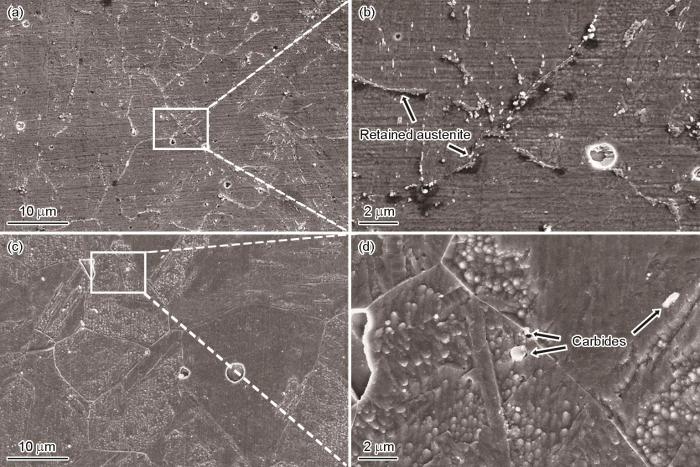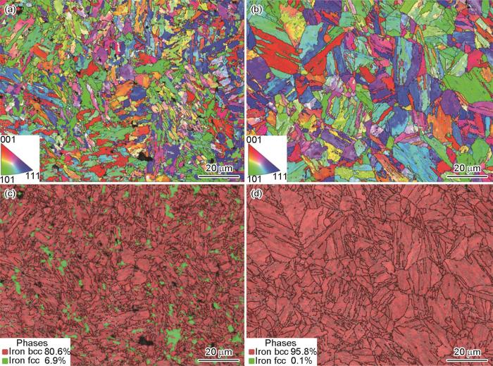 采用EBSD分析DED和挤压样品中马氏体和残余奥氏体的形态、尺寸和占比,得到的反极图(IPF)和相分布图分别见图4a,b和4c,d,其中图4a,c为2#DED样品,图4b,d为传统挤压件。可以看出,2#DED样品的奥氏体晶粒尺寸和晶内马氏体板条明显小于传统挤压样品。采用EBSD软件对马氏体板条的平均面积(用于对比相尺寸)进行分析,得到2#DED样品的平均马氏体板条面积为26 μm2,相较于传统挤压样品的80 μm2减少了67.5%。通过相分布图可知,2#DED样品中含有6.9% (体积分数)的残余奥氏体,大多呈带状和块状,主要分布于奥氏体晶界和马氏体相界处。与之相比,挤压样品的组织中仅含有0.1% (体积分数)的残余奥氏体。需要说明的是,由于样品表面电解抛光过程中产生了一些蚀孔,因此解析出来的两相体积占比之和未达到100%。EBSD的结果表明,DED样品最显著的特征是组织的细化和更高含量的残余奥氏体,这是由于DED的快速冷却作用增加了奥氏体晶粒形核数量并加速了马氏体相变过程,使得组织细化;同时,因为马氏体转变更快发生,晶界和马氏体相界处的高应力和受限空间增加了奥氏体相的稳定性,使部分奥氏体来不及向马氏体转变得以保留,因而残余奥氏体显著增多。