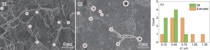 Comparison of the numbers and sizes of carbides in DED and extruded samples: (a) 2#DED; (b) extruded; (c) comparison of carbides features