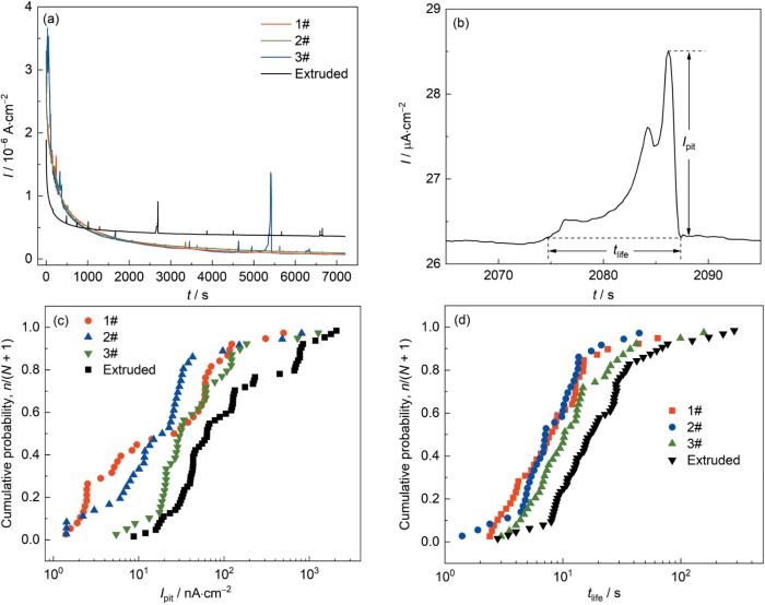 Metastable pitting behavior of 17-4PH stainless steel in 3.5%NaCl solution: (a) potentiostatic polarization curves at -0.05 V (vs. Ag/AgCl), (b) representative metastable pitting event, (c) cumulative probability distribution vsIpit, (d) cumulative probability distribution vstlife
