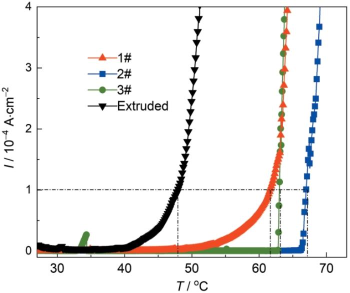临界点蚀温度(CPT)是衡量钝性金属材料在腐蚀环境中抗点蚀能力的一个重要指标,当环境温度高于CPT时,金属表面发生的亚稳态点蚀会发展为稳态点蚀,它可以量化评价金属的抗点蚀能力[10]。本文采用ASTM G150-2013标准[9]中的恒电位法进行测量,根据动电位极化曲线中的钝化区间选择-0.05 V (vs. Ag/AgCl)作为测试电位,实验结果如图7所示。挤压样品的CPT为47.9 ℃,1#、2#、3#DED样品的CPT分别为61.8、67.2和63.2 ℃,DED样品的CPT要显著高于传统挤压件,性能最优的2#DED样品CPT比挤压样品高19.3 ℃。说明DED样品的耐点蚀性能更好,其钝化膜在较高温度下仍能保持完整的致密结构,钝化膜的自修复能力更强,即使在局部发生亚稳态点蚀后也能迅速修复。CPT实验的结果与动电位极化测试反映的耐蚀性规律基本一致。